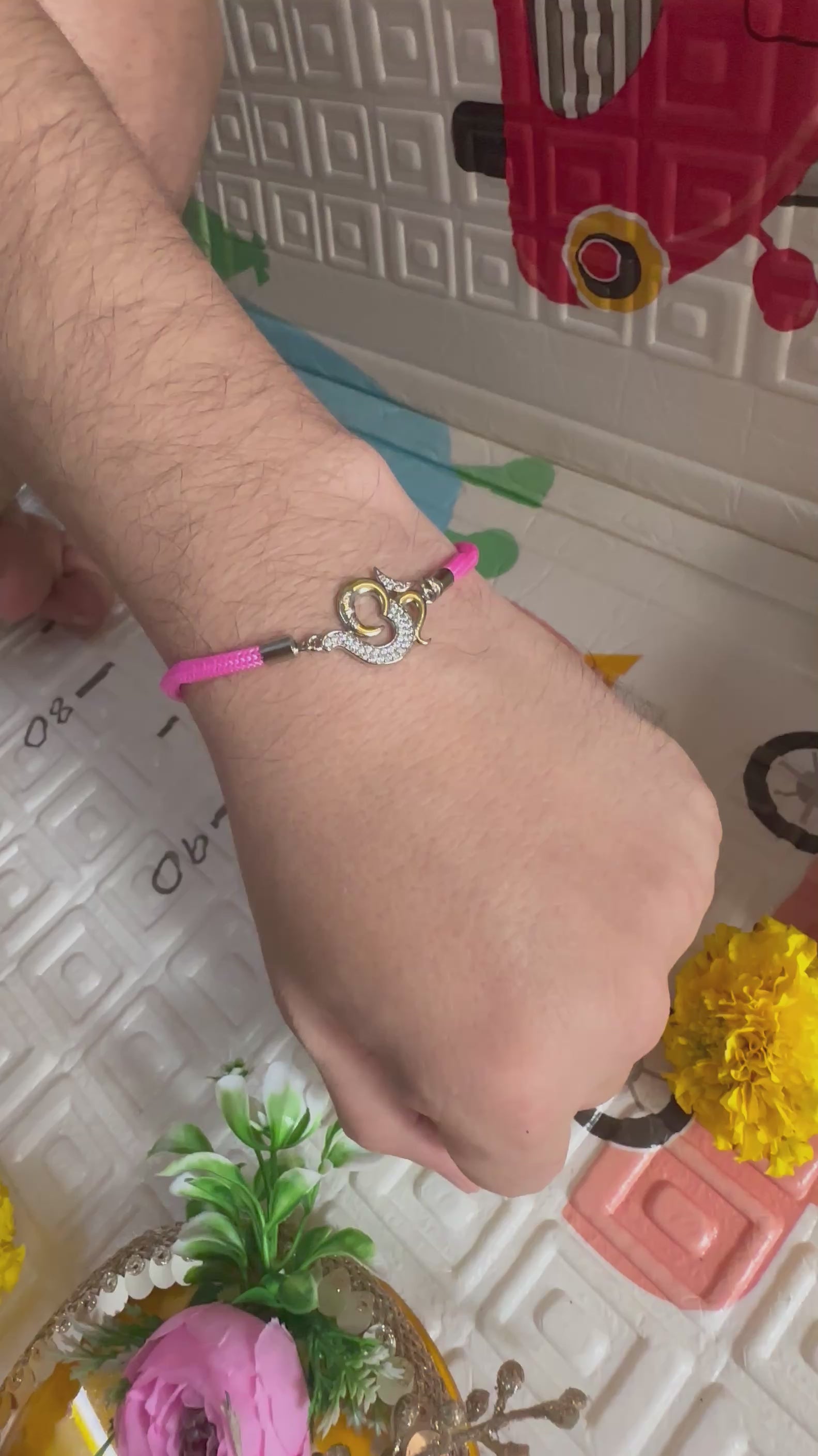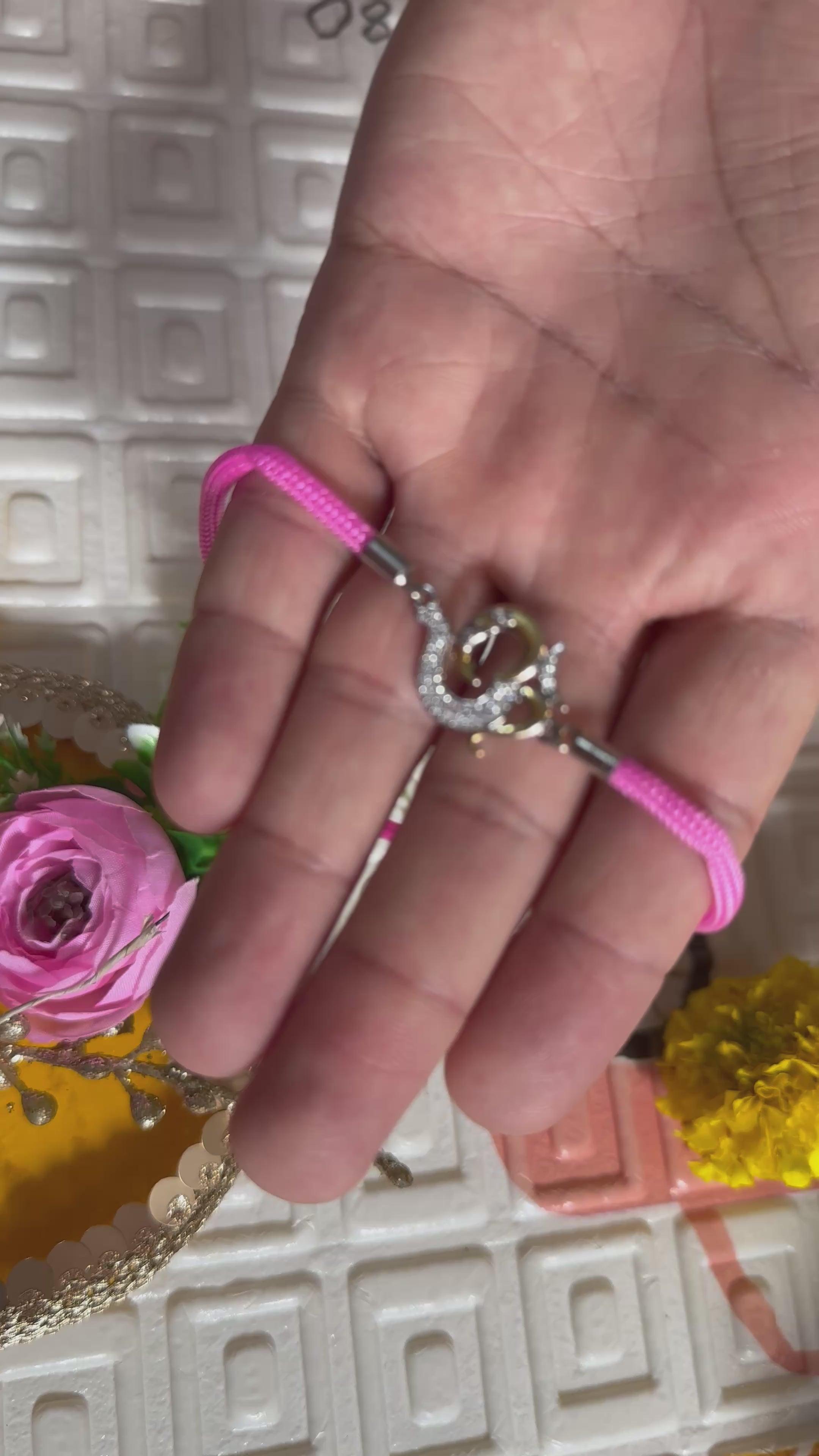 Celebrate the sacred bond of Raksha Bandhan with this elegant 93.5 pure silver Om Rakhi, a blend of tradition and modern style. The centerpiece features a finely crafted Om symbol adorned with dazzling cubic zirconia stones and a touch of gold polish for added grace. The rakhi is tied together with a vibrant pink braided thread, finished with sleek silver-toned caps and an adjustable slider for a perfect, secure fit.